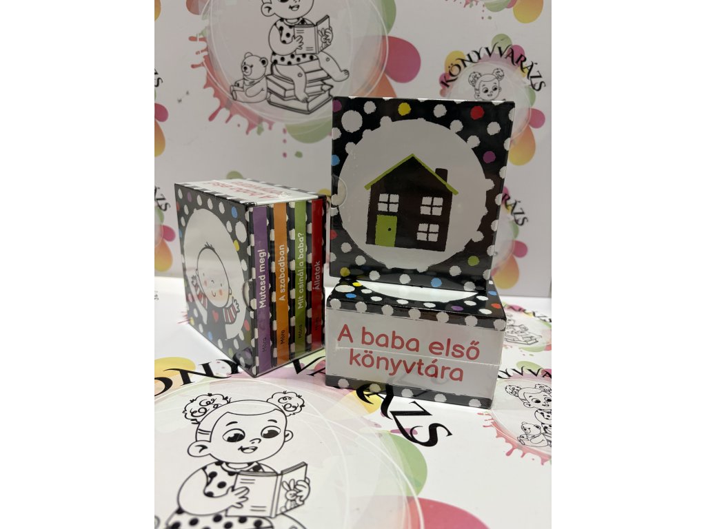 A baba első könyvtára: négy kis könyv egy dobozban. Mindegyik könyv kontrasztos fekete-fehér illusztrációkat tartalmaz, amelyek elősegítik a babák figyelmének összpontosítását. A vastag kartonlapos könyvek alkalmasak a közös lapozgatásra, de élükre állítva a babák egyedül is tudják nézegetni őket. Ideális ajándék lehet ez a kedves kis könyvtár a baba első könyveiből: Mit csinál a baba?, A szabadban, Állatok, Mutasd meg!